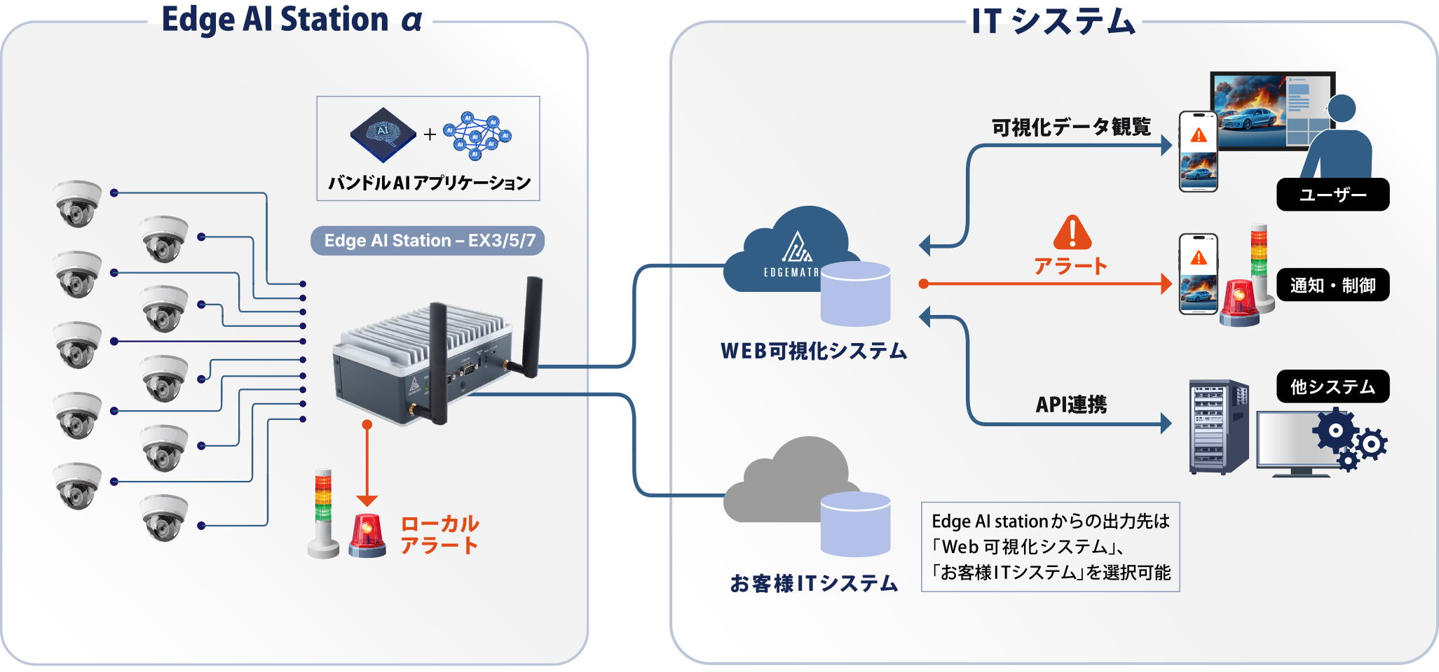 - 2. Edge AI Station:Edge AI Box EXシリーズに、多数のカメラとEdge AI Box、複数アプリケーションを遠隔運用管理するStaionOSを搭載するアプライアンス製品。外部ネットワークへの接続なしで単独動作が可能で、オンプレミスでの構成により通信コストの削減とプライバシー保護を実現します。